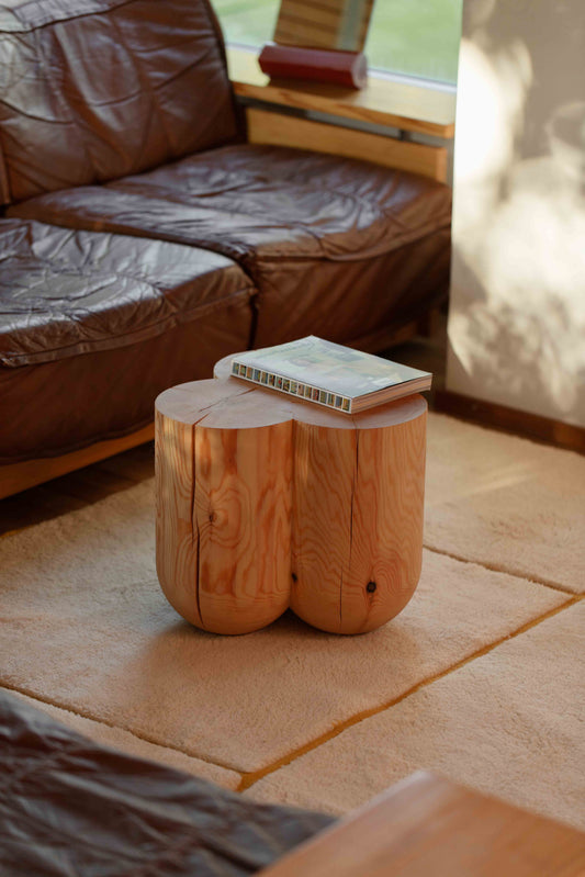 Pöydät on valmistettu sorvaamalla suomalaisen hirsitalotehtaan ylijäämähirsistä. Materiaalina pohjoisen tiheäsyinen mänty. Pöydät valmistetaan Suomessa.